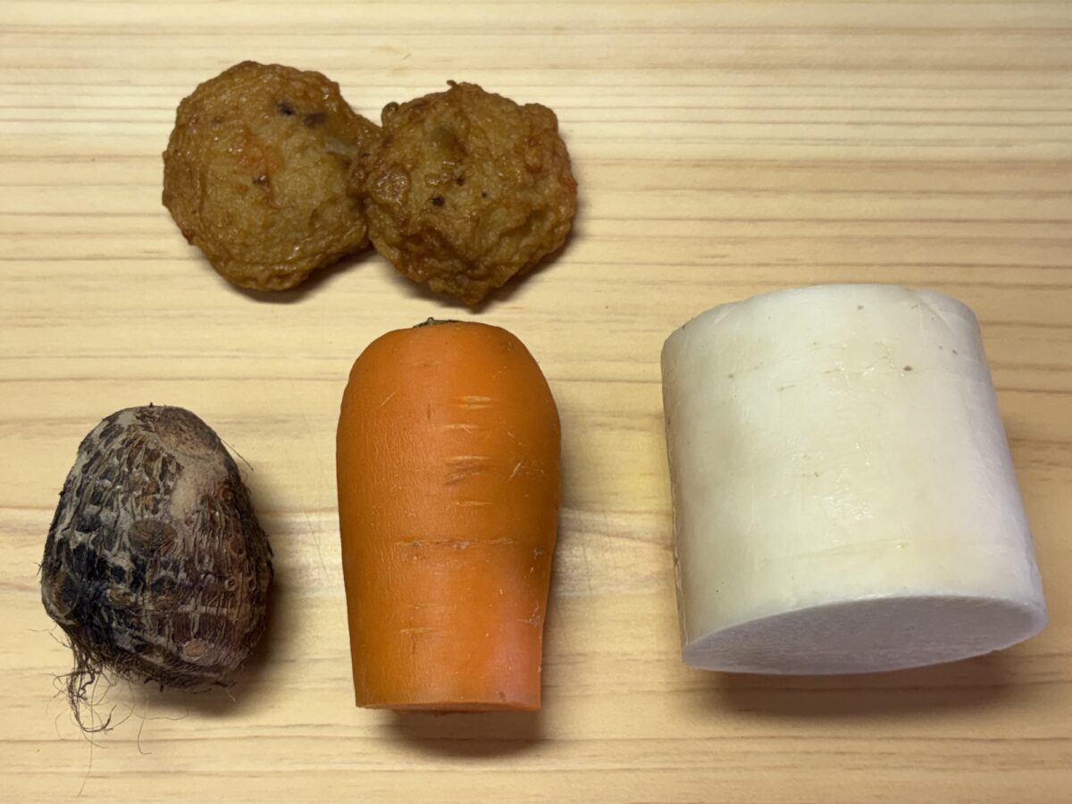 ※薩摩揚げの代わりに、ちくわ、なると、かまぼこなどの練り物でもOK!鶏肉も入ると汁がおいしくなるよ!